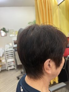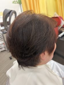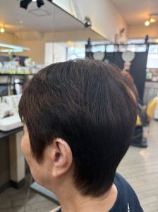 少し伸びていたのでお客様の骨格を確認して長さと量を調整して白髪はアロマカラーでで施術して仕上げはドライヤーで乾かすだけでこのスタイルになります😊