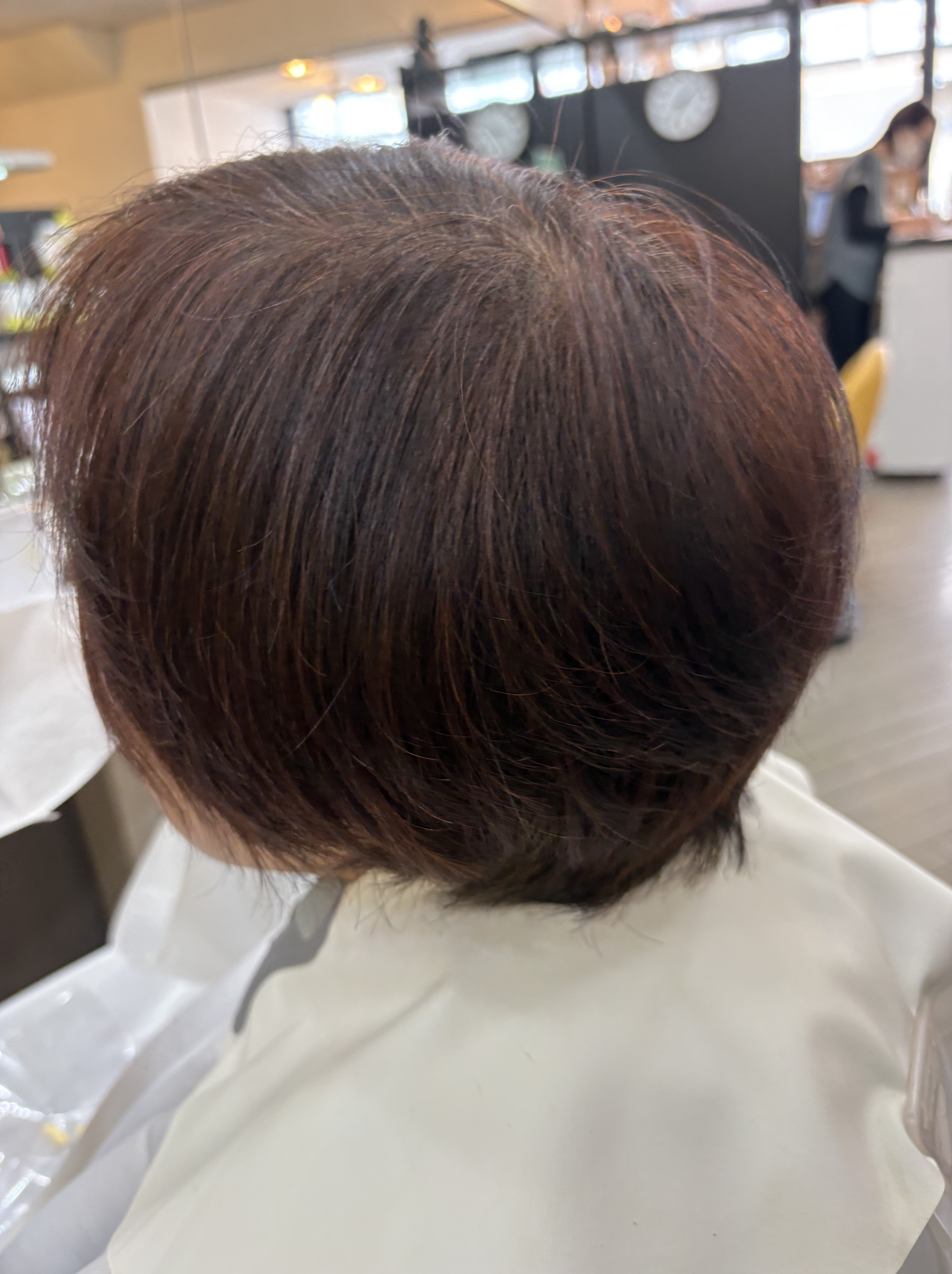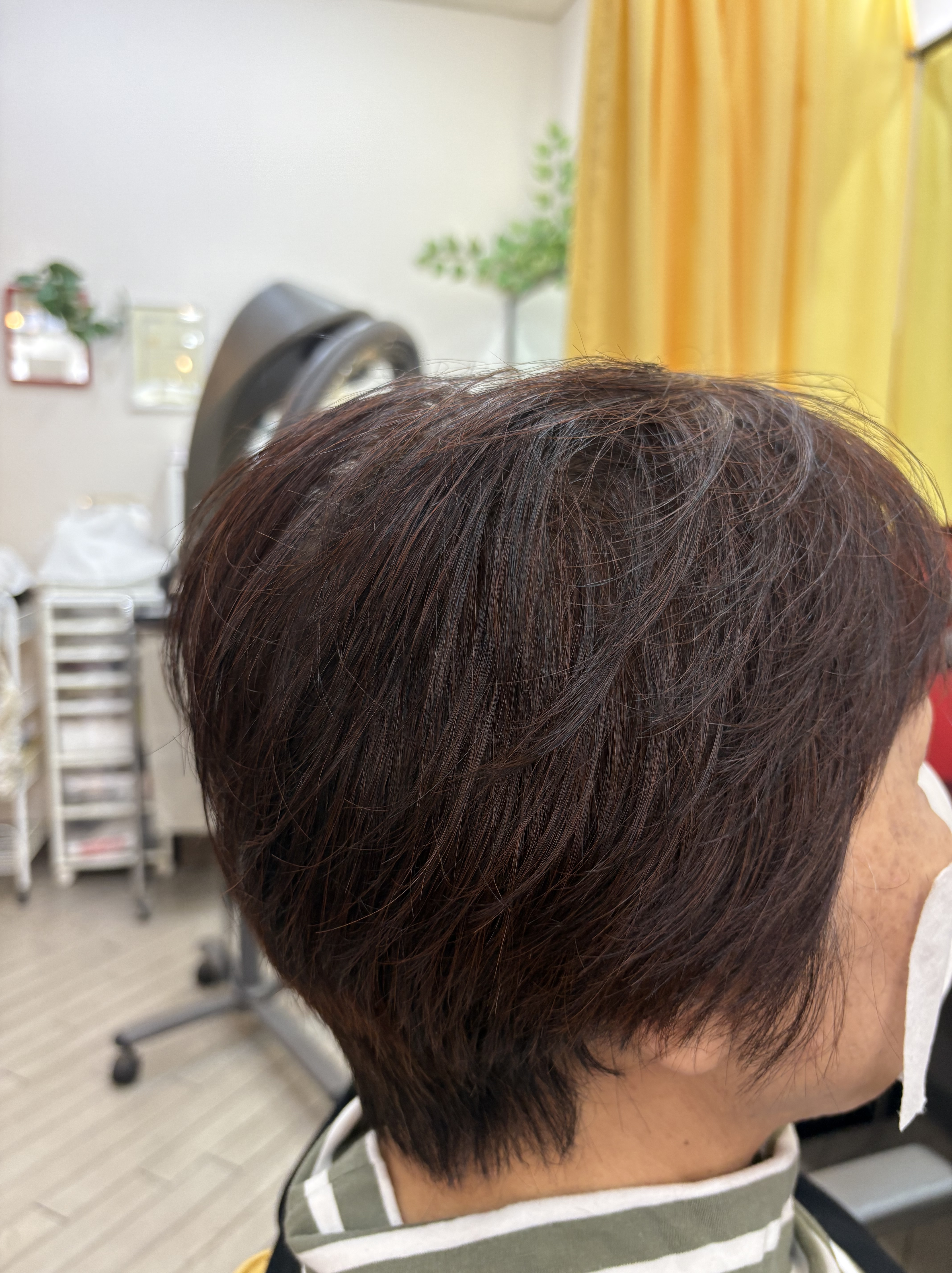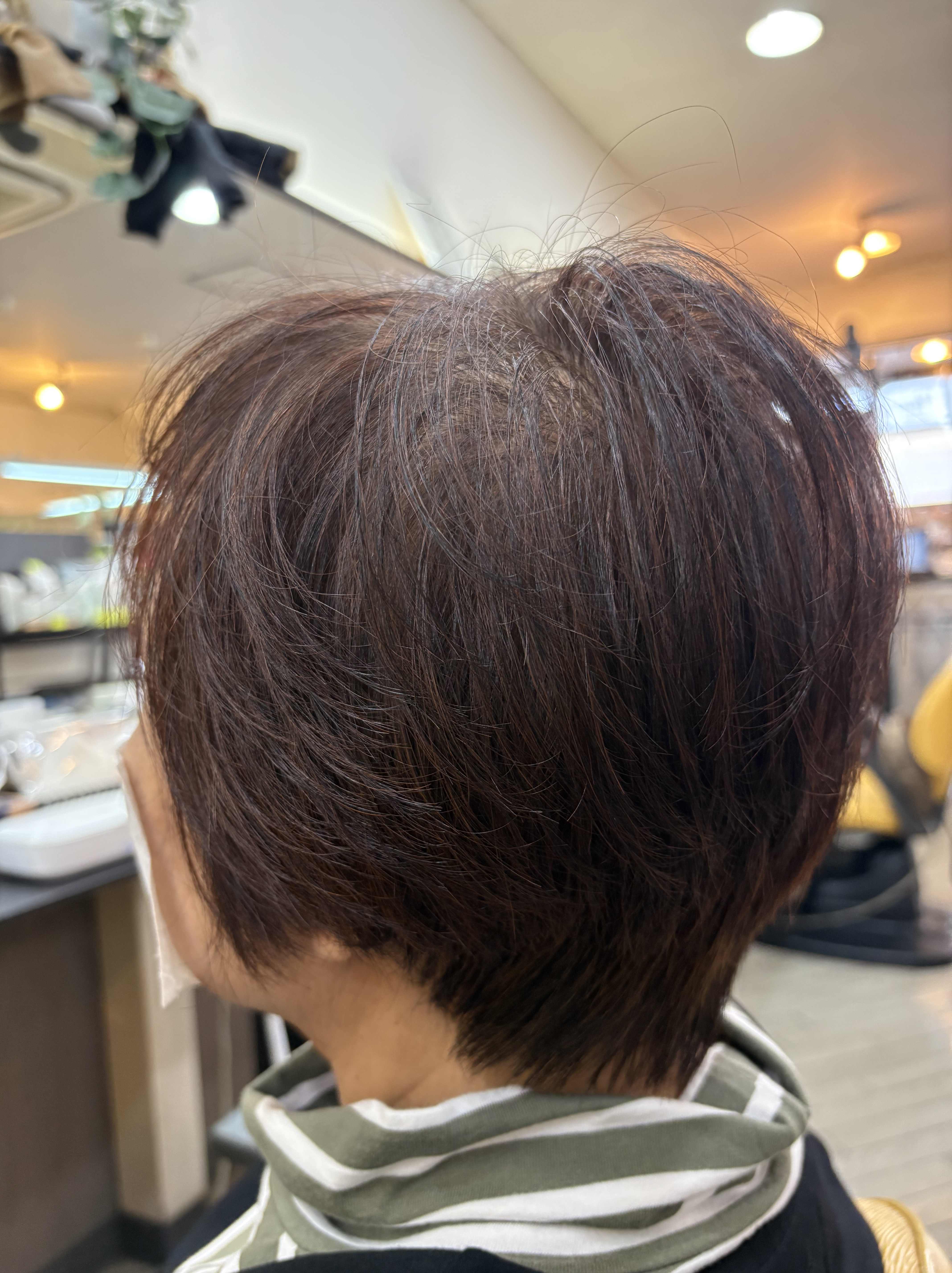 かなり伸びていてトップがぺっちゃんこで襟足が重くなっていたので骨格修正しながら長さと量を調整して白髪は美らヘナ+美ら藍で施術して仕上げはドライヤーで乾かすだけでこのスタイルになります😊