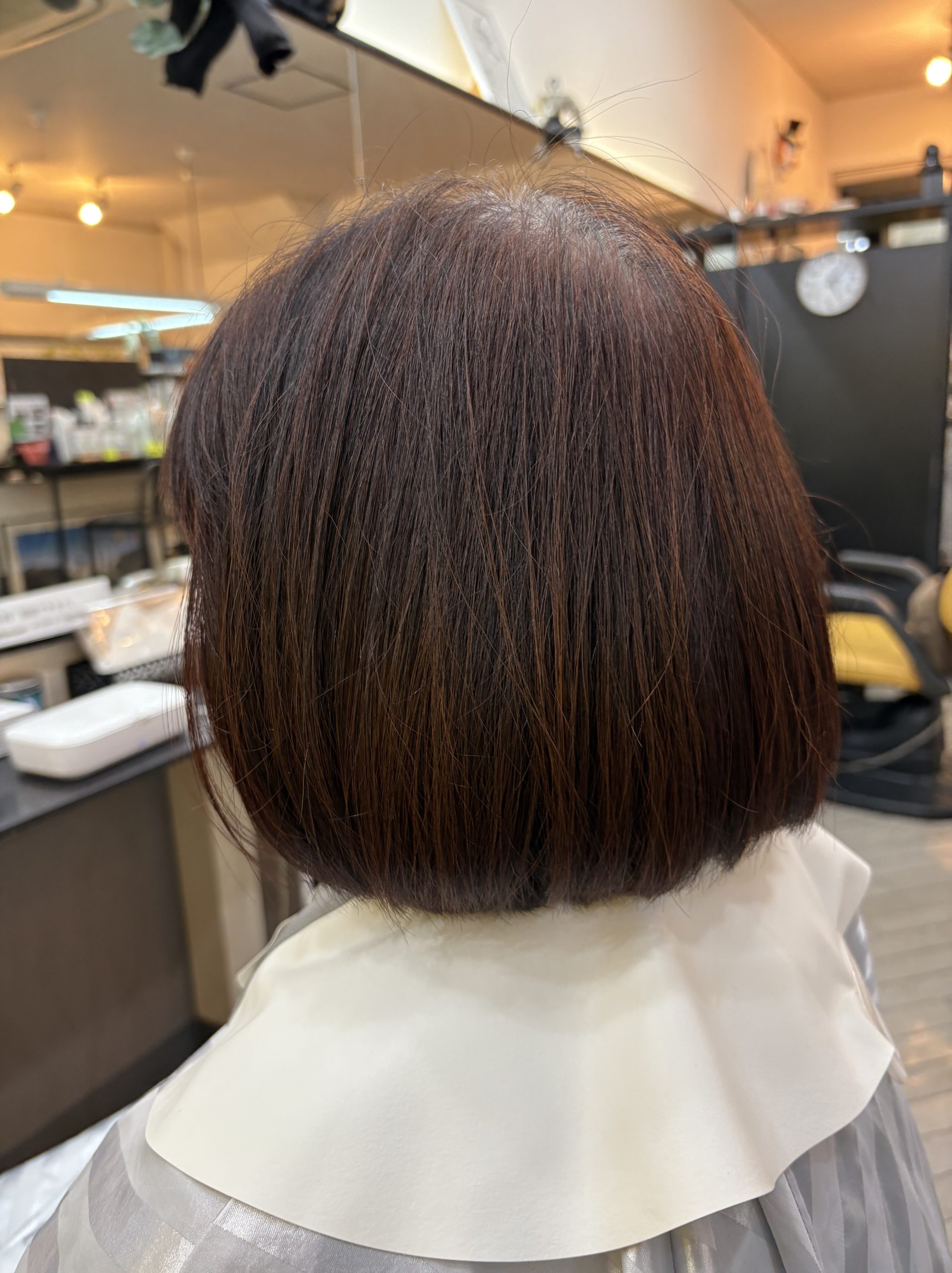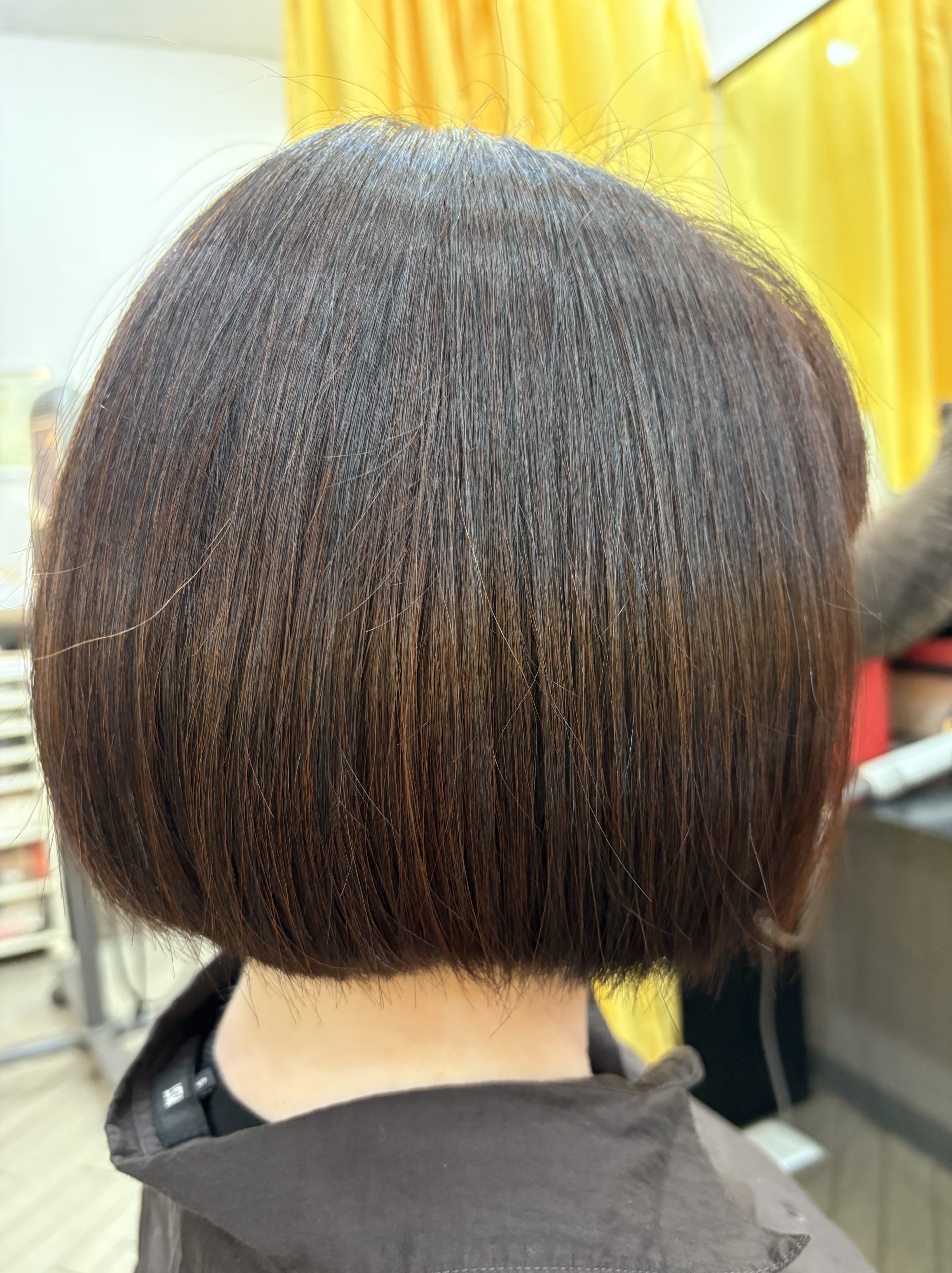 少し伸びていたので骨格修正しながら長さと量を調整してボブ風にして白髪は美らヘナ&美ら藍で施術して仕上げはドライヤーで乾かすだけでこのスタイルになります😊