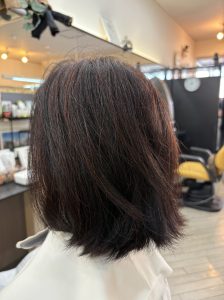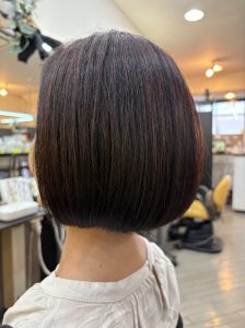 かなり伸びていて収まりが悪かったので骨格修正しながら長さと量を調整して襟足いっぱいのボブ風スタイルにして白髪は美らヘナで施術して仕上げはドライヤーで乾かすだけでこのスタイルになります😊